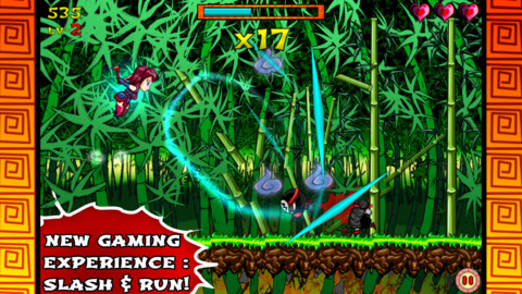 跑酷游戏一般比较强调速度感,需要快速的反应,不过在《斩铁剑 Ninja Slash!》上,跑酷的内容还算比较简单,速度比较慢,而且只有一个跳跃键,这样你就觉得难度低了吗?真不是,游戏界面中玩家会因双手操作而变得非常忙,对玩家的反应敏捷和能量控制提出了新的要求,这里的能量控制指的是女忍者的指划砍杀动作,这一动作需要精气维系,每一次砍杀动作都会消耗一定的精气,而在干掉敌人之后会留下自己的魂魄,这是忍者补充精气的最好来源。