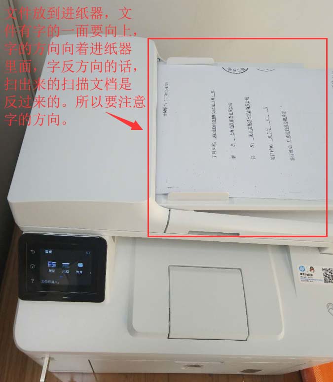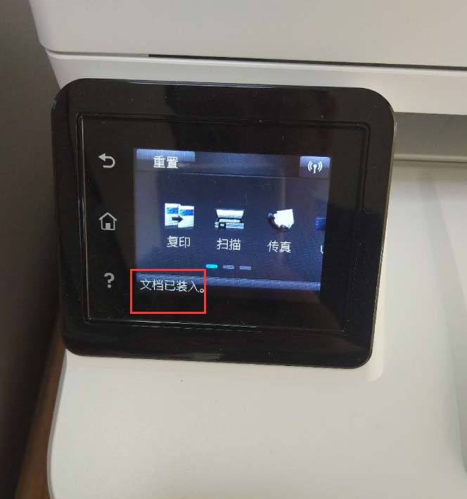 2、放入需要扫描的文件到“文档进纸器”,这里需要注意文件的放置位置,首先文件需要打描的一面要向上,而且文字方向要向进纸器里面,否则扫描出来的文件是空的或是文字倒过来的。放入文档后,显示屏会“文档已装入”